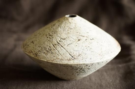 手びねりによって形作られる作品は、削りながらバランスを整え造形的にもとても美しいフォルムを生み出しています。また釉薬を掛けた後、部分的に削ることで現れる独特な土肌の景色も美しく、土という素材の面白さを感じていただけるかと思います。最近では従来の白土の作品の他、黒土を使った作品でさらに表現の幅を広げていたりと、今後もますます楽しみな陶芸作家です。