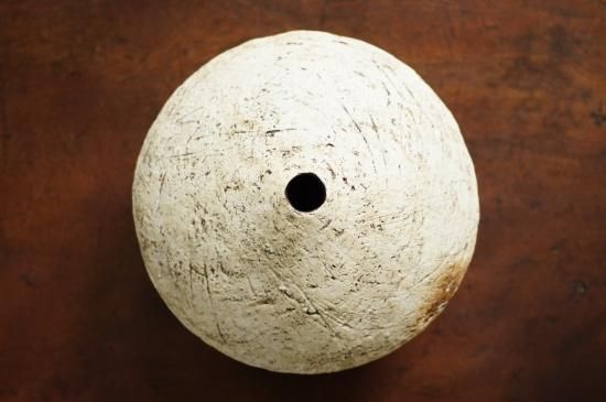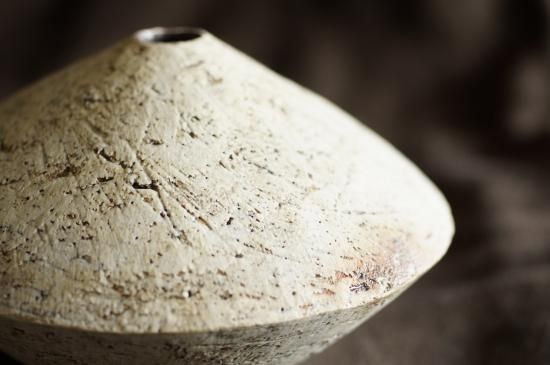 アーティスティックな雰囲気の漂う花器です。マットな質感と複雑な表情を持った表面の色合いが美しく、またキリッとした力強さも感じられる作品です。真横から眺めると中央部分のエッジの鋭さが綺麗な陰影を生み、美しい景色が広がります。側面にあるふわりとした茶色は貝殻を付けて焼成した模様で作品のアクセントになっています。花器として、オブジェとしてお使いいただけます。
