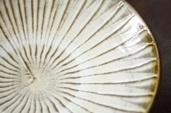 刷毛をやや寝かせた状態で、均一に少しづつずらしながら化粧土を塗る事によって描かれる刷毛目の模様。飛びかんな同様に小鹿田焼で多様される人気の装飾技法のひとつです。