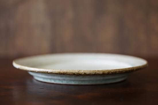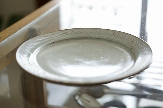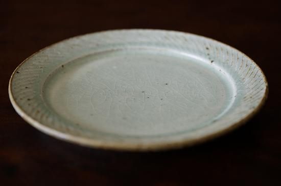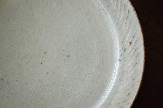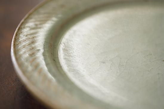 リム部分に鎬の模様が施されたシンプルで美しいプレート。フラットなプレートなので使い勝手もよくサイズ的にもとても重宝するプレートになってくれそうです。全体に透明感のある淡い緑の色合いが広がっていて、とても美しい色合いのプレートです。