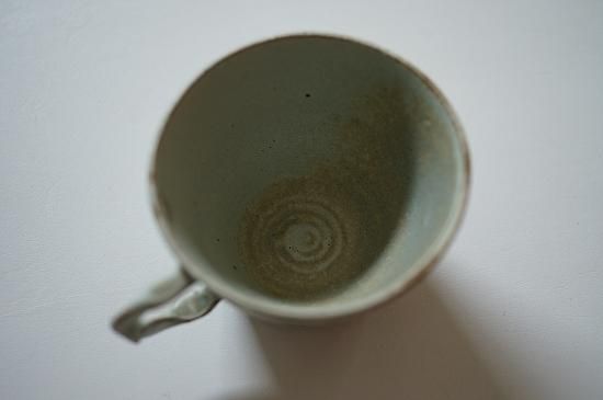 マットな質感とすっきりとシンプルなフォルム、またオリジナリティ溢れるハンドル部分や表面の模様など、繊細で可愛らしい雰囲気のマグカップです。色は淡い緑と水色の中間ぐらいのアンティークのような趣のある水色です。