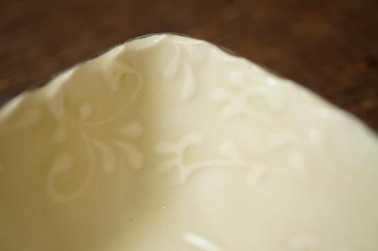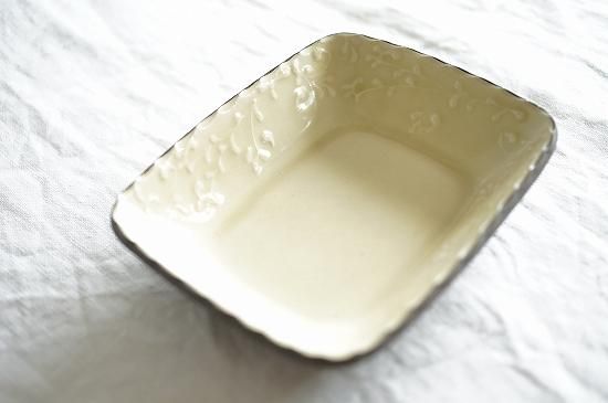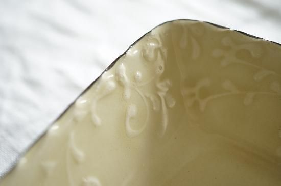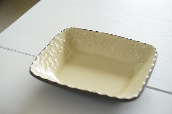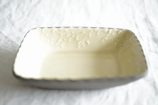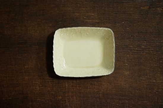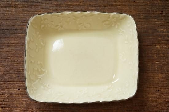 縁に描かれた繊細でリズミカルなイッチンによる唐草模様が美しくお料理を引き立たせてくれそうです。果物や焼き菓子などが似合いそうなサイズ感の長角鉢です。