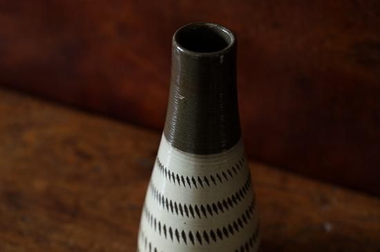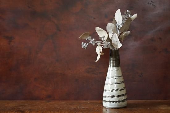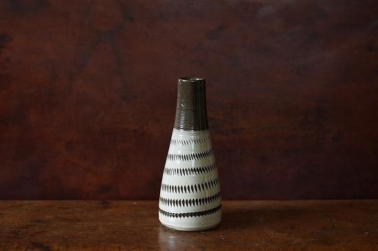 どことなく有機的に感じられる優し気なフォルムと焦げ茶色と白地に飛び鉋模様がシンプルで美しい花瓶。安定感のある形でバランス良く活けられます。