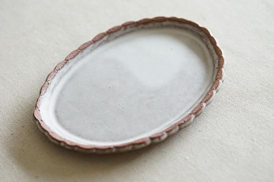 ふんわりとしたマットな質感の色合いが魅力的で、またリム部分はモコモコとした可愛らしい形の焼締めで仕上げられており、うつわ全体の印象を引き締った印象にしています。繊細さや可愛らしさ、焼物ならではの味わい深さが感じられる細部のディテールに拘った可愛らしい小さなオーバルプレートです。お菓子をのせたり、小振りな取り皿などにお使いいただけるサイズ感です。