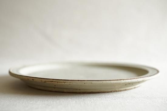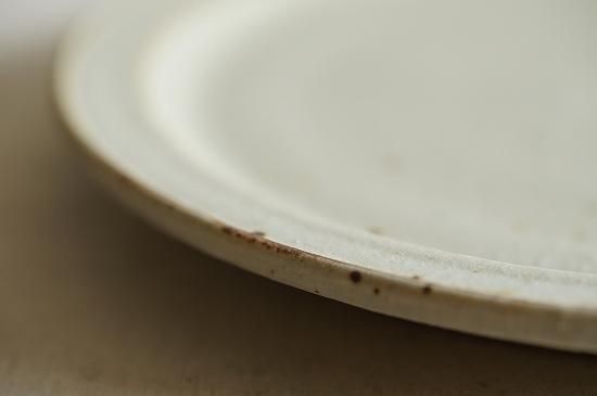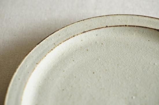 装飾のない細めのリムとほぼフラットなプレート。色合いは表現が難しいのですが、僅かに淡く緑と黄色掛かったように感じる白です。カサッとしたマット質感。シンプルなうつわなだけに美しいフォルムと微妙な色合いや光の反射のない独特な質感などが強調されて見えます。お料理のジャンルを問わずお使いいただける伊藤さんらしい幅広く使えるうつわです。やや厚さのある作りのため重みを感じるかも知れません。