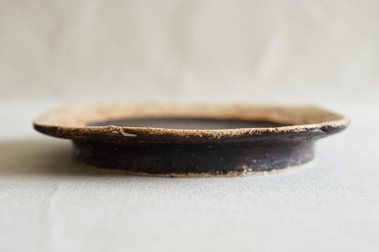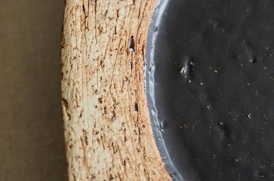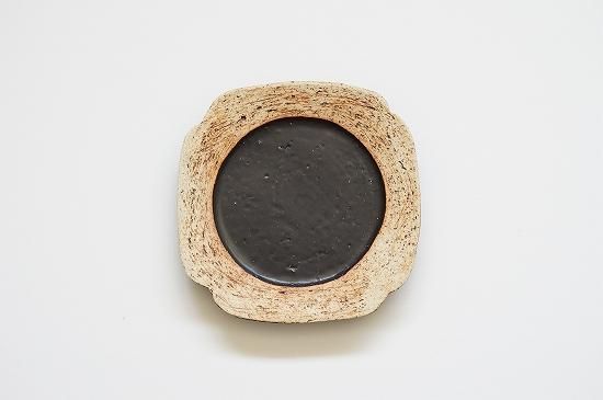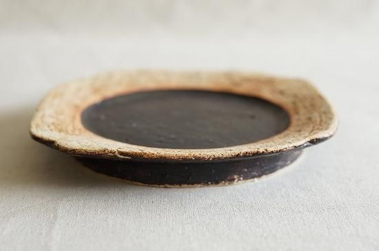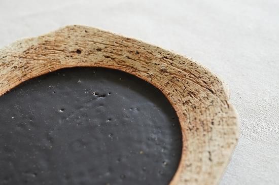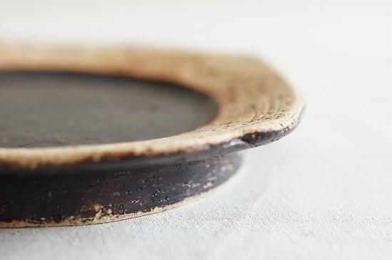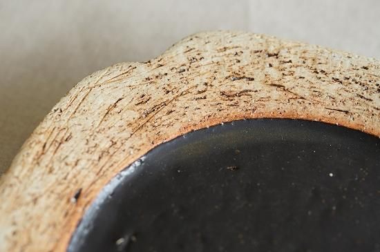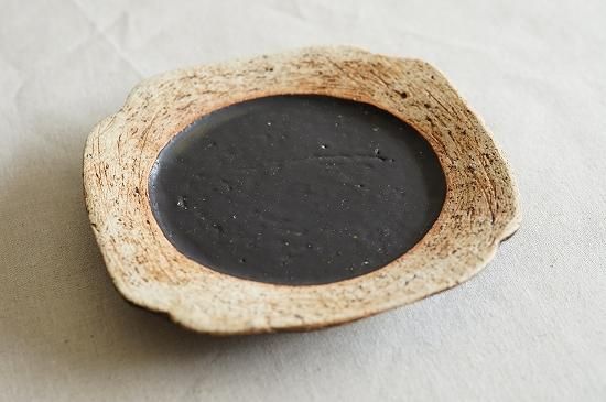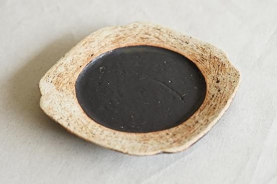 リム部分の土肌と黒とのコントラストの美しいおよそ5寸サイズのプレート。花びらのようにも見える形が可愛らしくもキリッとした印象のあるプレートです。