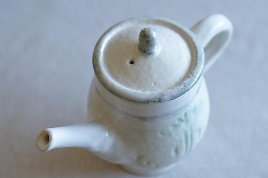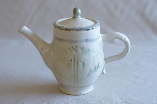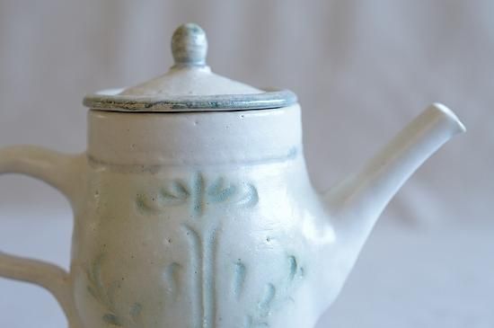 すっとしたスマートで美しいフォルムのポット。マットな質感とあたたかみのある白地に、淡い緑色で描かれた植物モチーフの模様が描かれています。