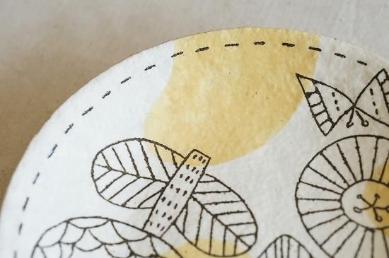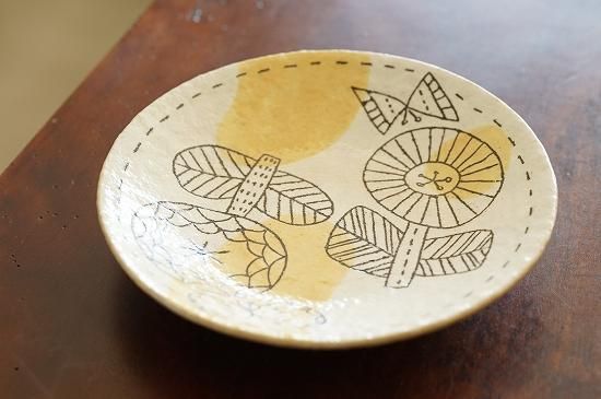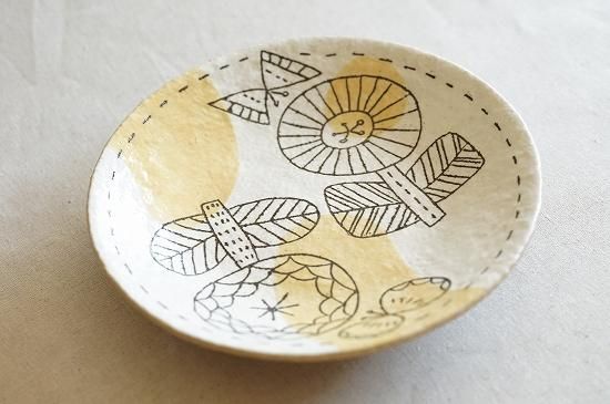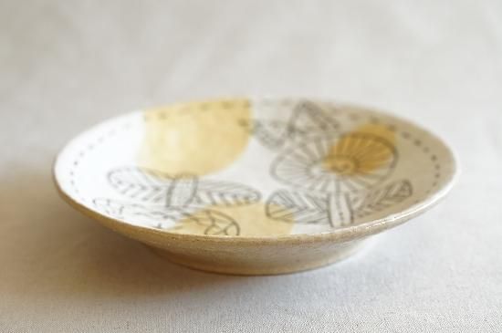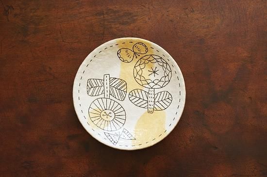 白地に描かれたお花や蝶々の図柄が可愛らしい雰囲気のうつわ。ふわりと射しこまれた黄色も楽し気な印象です。