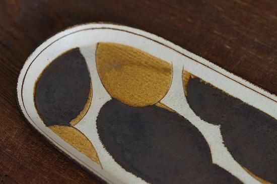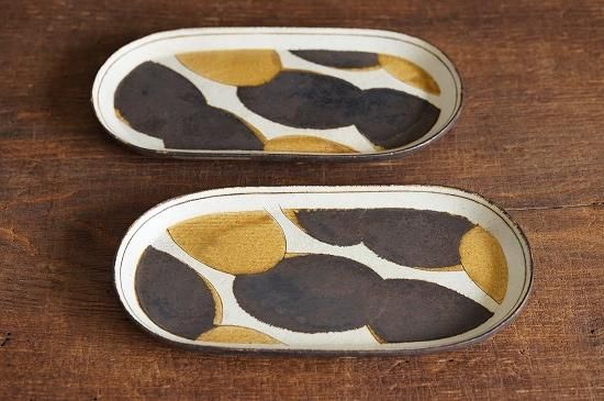 土の持つ質感や肌ざわりを残した作品は、白、黄、茶、黒などの色によって幾何学的な模様がひとつひとつ丁寧に描かれており、どれもがそれぞれに独特な市岡さんの作品に仕上がっています。作品によって、アフリカンアートを思わせるプリミティブな雰囲気のもの、ポップアートやモダンアートを感じさせるもの、また可愛らしい雰囲気のものなど、見方によって見る人によって作品の感じ方が多様なのも市岡さんの作品の特徴なのかもしれません。